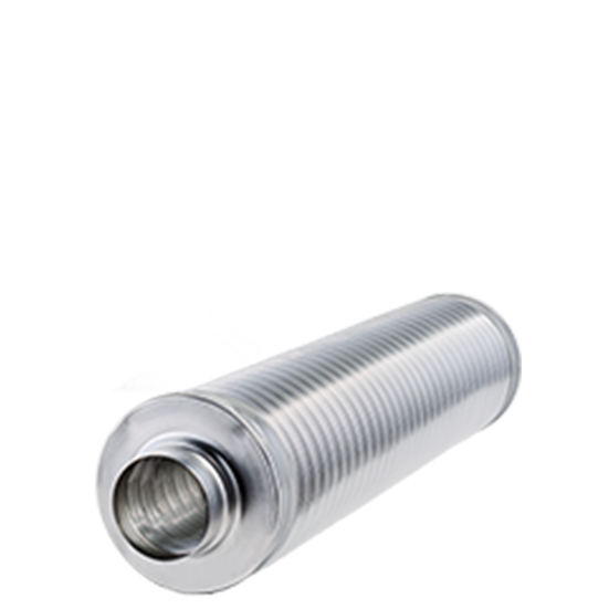 Ausführung: Gehäuse besteht aus flexiblen Alu- Hüllrohr, die innere Schale aus perforiertem Alu Rohr. Der Anschluss wird über Steckverbinder realisiert. Das Absorbermaterial ist unbrennbar nach DIN 4102 und gesundheitlich unbedenklich (biolöslich oder >Kl40).