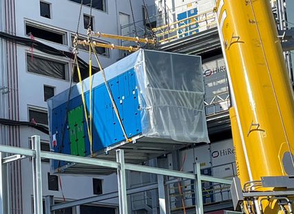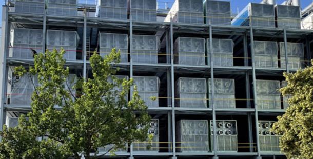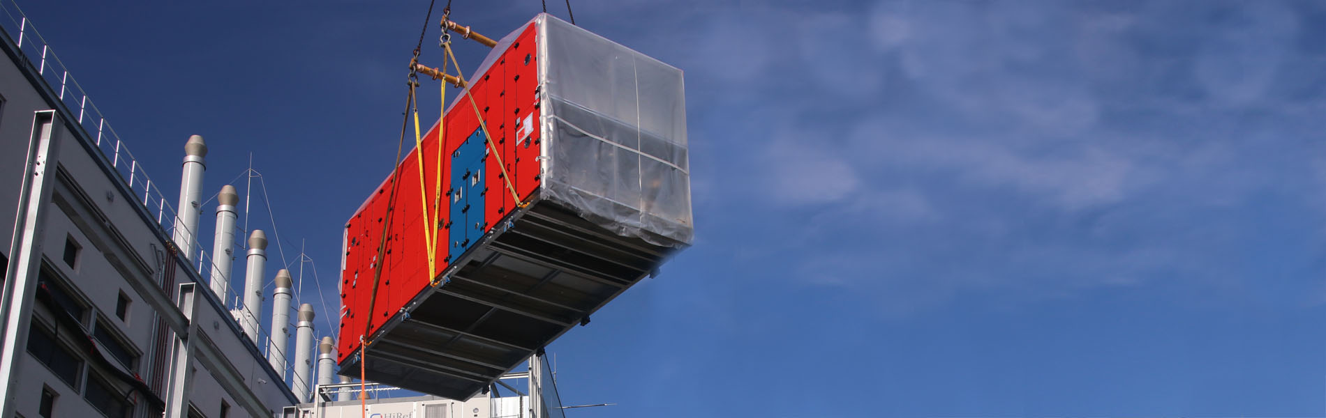 Bei den Klimageräten der Baureihe DataCond handelt es sich um Präzisionsklimageräte, die sich exakt auf die entstehenden Temperaturdifferenzen anpassen lassen. Mit der langjährigen Erfahrung und der Expertise in der Klimatechnik, wußte man bei BerlinerLuft. genau, worauf es bei den Planungen eines Projektes dieser Größenordnung ankommt. Trotzdem: Die Baugrößen und auch die berechneten Dimensionen der insgesamt 32 Klimageräte waren neu. Die Gerätegrößen waren mit 3 m Tiefe, 3,60 m Höhe, 8 m Länge und einem Gewicht von 9 t buchstäblich überdimensional. So wurde eigens für Klimatisierung eine Stahlkonstruktion über vier Stockwerke an dem Gebäude angedockt.
