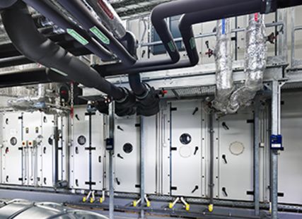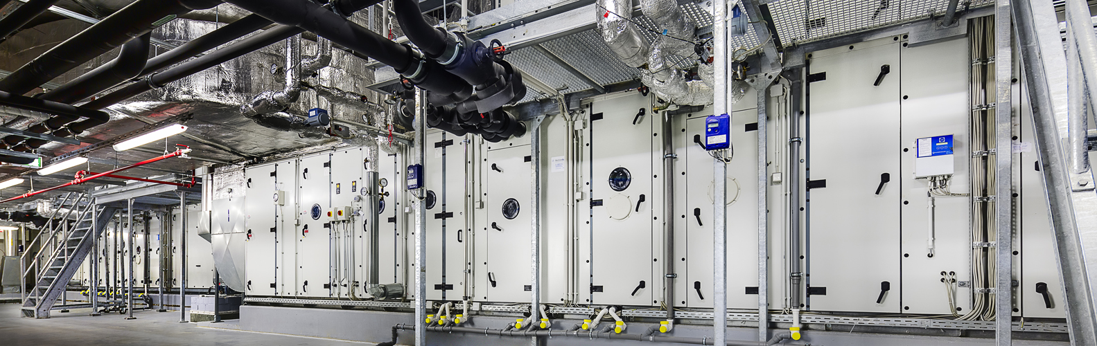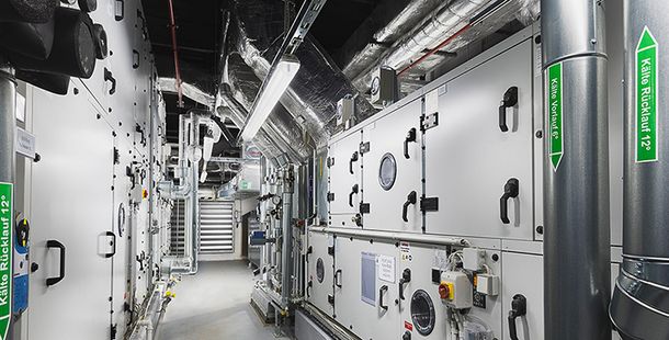 Zur Klimatisierung lieferte BerlinerLuft. 17 Klimazentralgeräte, die mit einem Gesamtvolumenstrom von 500.000 m³/h mehrere Büroetagen belüften. Für die Wärmerückgewinnung kommt das hocheffiziente System EcoCond zum Einsatz.