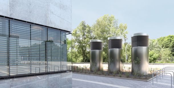 Darunter steckt ein durchdachtes und leistungsfähiges Lüftungskonzept: Drei Aussenluft-Ansaugtürme sorgen für die Frischluft-Zufuhr des Gebäudes mit Volumenströmen von 26.000 m³/h pro Turm. Die Luft wird dabei über die bündigen Lamellen im 45° Winkel von unten angesaugt.